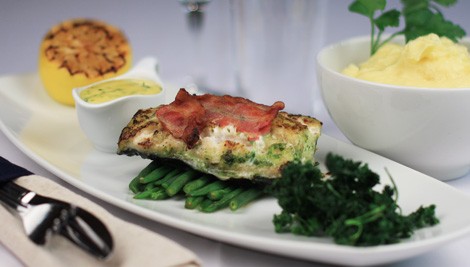 Servera med bearnaisesås, olivoljefrästa haricots verts, friterad persilja och puré på mandelpotatis och jordärtskockor.